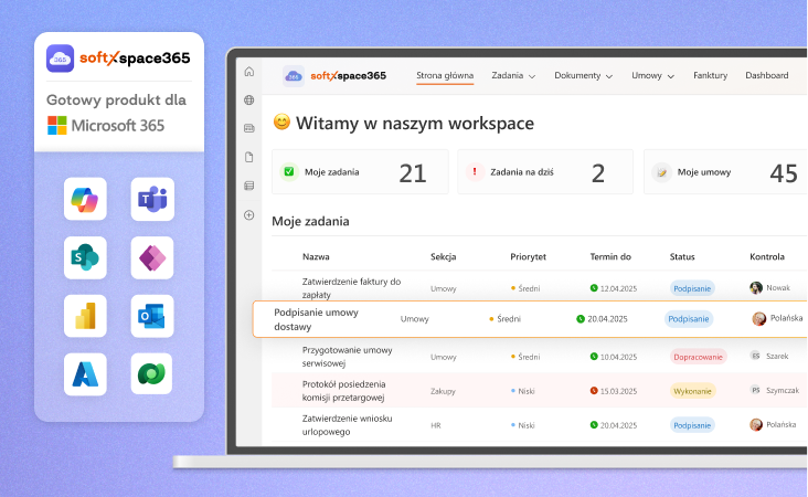 Zarządzanie Dokumentami i Automatyzacja Procesów dla każdej firmy. Cyfrowa przestrzeń robocza w Teams i SharePoint, generowanie dokumentów z szablonów, podpisy elektroniczne, obieg umów i faktur (KSeF), archiwum z wyszukiwaniem, konstruktor procesów No-Code oraz integracja z ERP/CRM.